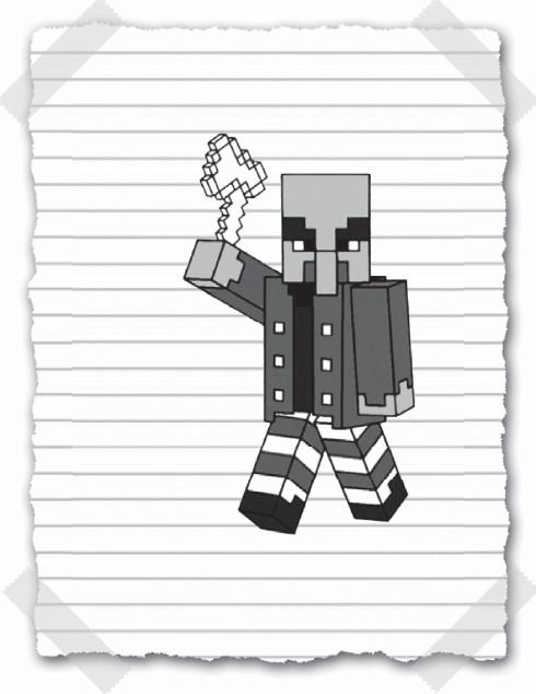 Бедный селянин сейчас попадёт в ловушку! Зомби точно его сожрёт! Я как можно быстрее достал новую стрелу, но, прежде чем я выстрелил, селянин вышел из-за лестницы. Таких селян я ещё не видел! Вместо обычной робы на нём были полосатые штаны и тёмный пиджак с большими пуговицами. Все селяне, которых я видел, в ужасе убегали при виде зомби. Но мистер Полосатые Штаны сделал что-то, чего я совсем не ожидал! Он достал железный топор и бросился прямо на монстра!