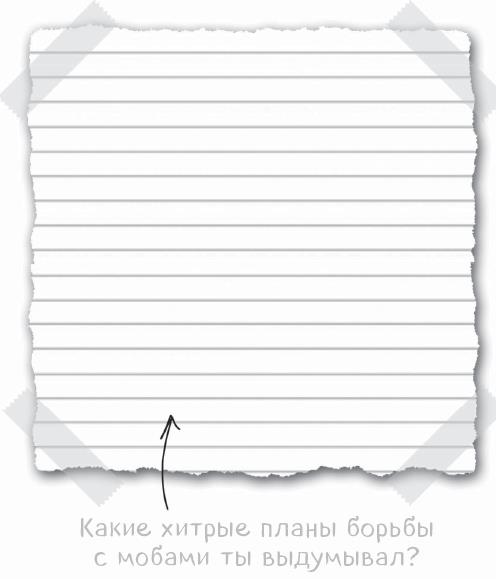 Когда горизонт был чист, я попрощался с Му-у и отправился к НЛО. В тени стояла небольшая толпа зомби, скелетов и два крипера. Как же мне установить факелы? Я знал, что не могу драться с ними всеми сразу. Поэтому я решил, что единственный выход – перехитрить их. (Что это вы так улыбаетесь? Это вполне возможно!)