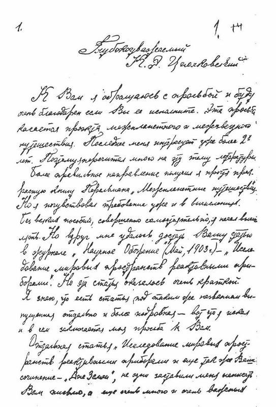 Первая страница первого письма В.П.Глушко к К.Э.Циолковскому.