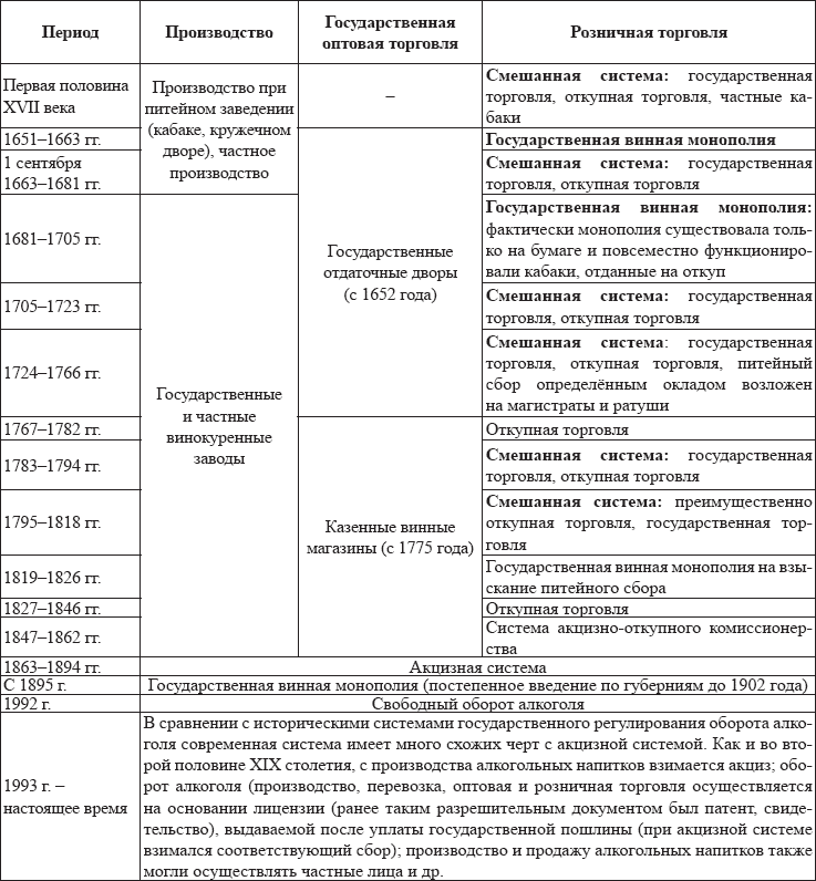 Основной фискальный интерес для государства в XVII – первой половине XIX вв. представлял питейный сбор. В связи с этим особенности государственного регулирования производства и оборота алкоголя зависели от того, оставляло ли за собой государство право на винную торговлю и взыскание питейного сбора, то есть вводило винную монополию либо передавало это право частным лицам, отдавая на откуп (см. табл. 1).