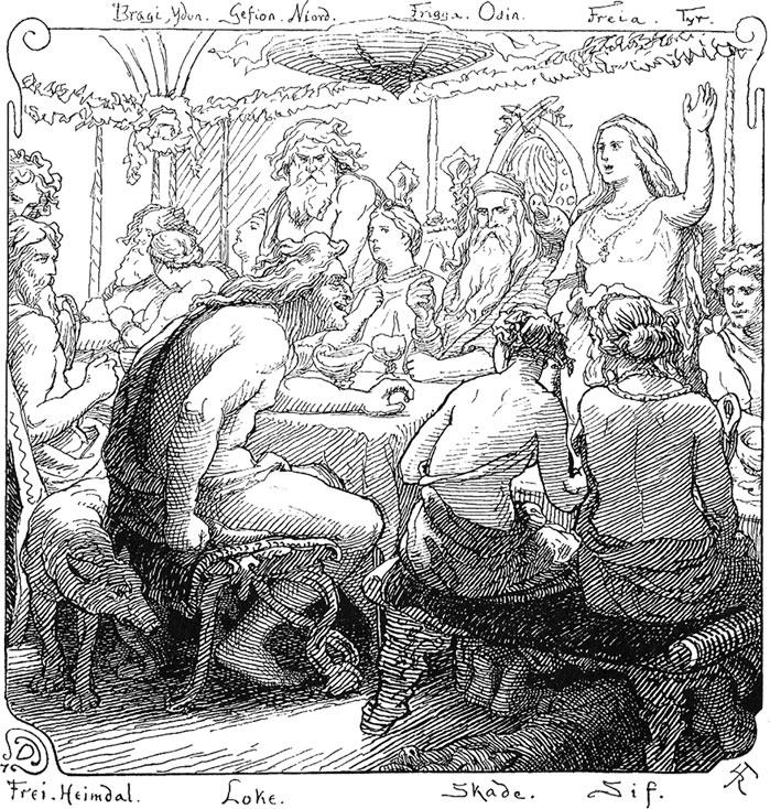 Рис. 1. «Викторианские» викинги. Необычный рисунок Лоренца Фролиха (1895) изображает пир богов из древнескандинавской поэмы «Перебранка Локи». Боги-асы похожи одновременно на античные скульптуры пирующих варваров и на чопорных гостей викторианских званых ужинов, Локи ведет себя как подвыпивший дядюшка, и все это происходит в чертогах рококо с подобием люстры под потолком
