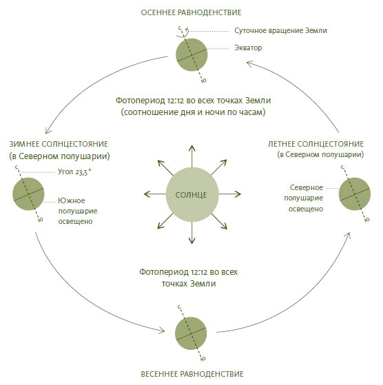Годовое путешествие Земли вокруг Солнца и сезоны в зависимости от наклона оси вращения планеты. Во время солнцестояний между полярными регионами планеты наблюдается наибольшая разница в продолжительности дня и ночи. Во время равноденствий соотношение дня и ночи одинаково во всех точках Земли