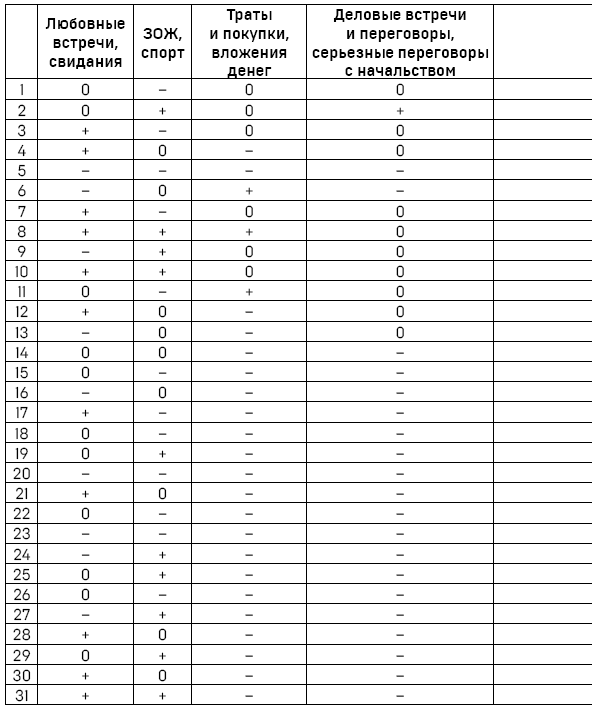 Деловые встречи и переговоры, серьезные переговоры с начальством: + благоприятный день; – неблагоприятный день; 0 нейтральный день