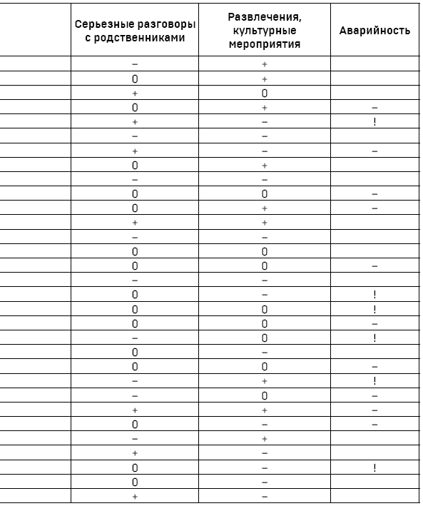Серьезные разговоры с родственниками: + благоприятный день; – неблагоприятный день; 0 нейтральный день