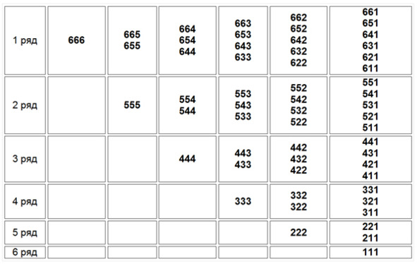 Приводимый «номер» есть набор чисел на кубике. Комбинации выпадаемых костей здесь построены от большего к меньшему, поэтому самым первым набором приводится самое большое – это сочетание 666 (кстати, без всякой привязки к «звериному числу» Апокалипсиса!).