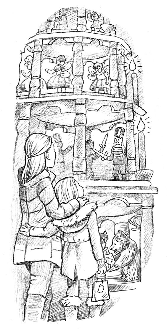 – Нет. Мне здесь нравится. Может, посмотрим рождественскую пирамиду? У продавца игрушек была такая на прилавке. Но без свечек.