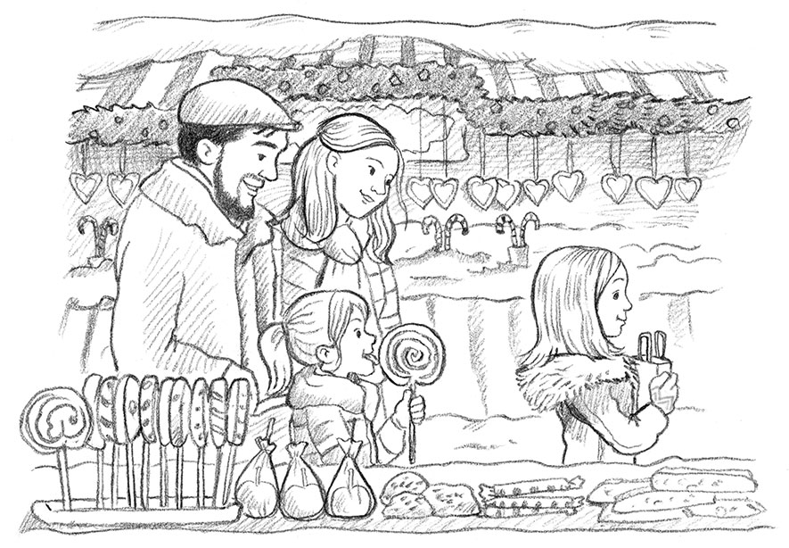 Они шли по ярко освещённым дорожкам меж киосков, то и дело посматривая на высившуюся над площадью рождественскую пирамиду. Ханна решила, что у неё – шесть, а то и семь ярусов. Папа прав: всё должно выглядеть так, будто винт наверху запускал зажжённые свечи. Вот только свечи в огромной пирамиде были электрические – большие-пребольшие, выше Ханны!