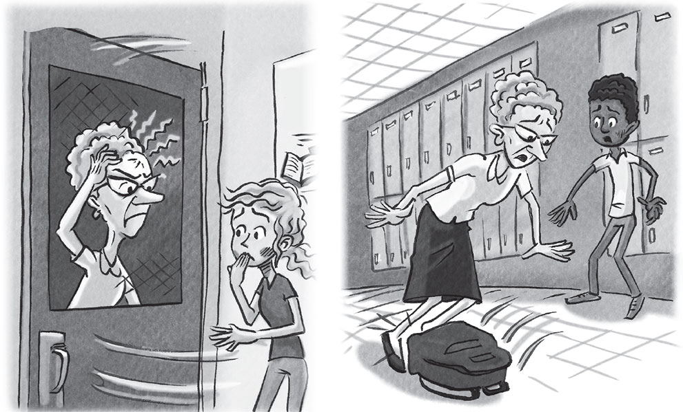 Сперва в беду попала Люси. Она держала дверь, и тут та вырвалась у неё из рук и врезала по лицу мисс Гринкер! Со стороны это выглядело так, будто Люси стукнула учительницу дверью специально. Мисс Гринкер вынесла ей предупреждение.