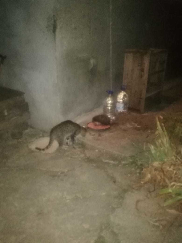 Откуда-то появился третий. Две кошки и кот, что до этого тёрлись у наших ног, забеспокоились, и тоже подошли поближе к миске. Одна из них начала есть вместе с ёжиками.