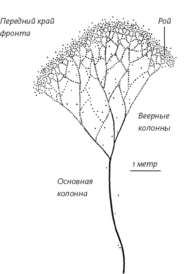 В терминологии исследователей муравьев-кочевников передняя граница, где рабочие выбегают вперед родичей, называется «фронт» (или «передовая») роя. Рой[35] в данном случае – это скопление муравьев позади фронта, а веер – это тянущаяся назад сеть колонн рабочих, которая сливается и образует единую главную колонну, которая устремляется к гнезду. Среди муравьев-кочевников роевый рейд свойственен некоторым муравьям Нового Света видов Eciton и Labidus и нескольким африканским видам Dorylus, известным как муравьи-погонщики. Мелкие стычки в рейде кажутся хаотичными, если смотреть на них изолированно; но, когда рейд рассматривается как единое целое, возникает ощущение порядка и даже эстетической красоты.