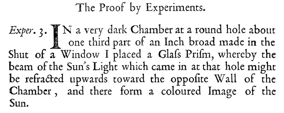 Эксперимент № 3. «Очень темная комната с круглым отверстием около одной трети дюйма шириной, сделанным в ставнях закрытого окна. Я расположил стеклянную призму так, чтобы луч солнечного света, который проходил через это отверстие, мог преломляться и попадать на противоположную стену комнаты и там образовывать цветное изображение солнца».