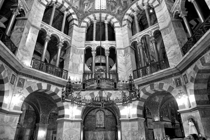 Возвращаясь из Рима домой, Карл посетил Равенну и увидел величественные архитектурные сооружения с роскошными интерьерами, построенные при византийских императорах, которые, к слову сказать, никогда в Равенну не наведывались. Увидел, в частности, мозаичные портреты императора Юстиниана и его жены Феодоры в базилике Сан-Витале – и впервые осознал, каким великолепием может окружить себя императорская власть. (Добавлю в скобках, что сам он всегда одевался просто, довольствуясь однотонной голубой мантией поверх обычного франкского платья.) По возвращении в свою ахенскую резиденцию (устроенную вблизи термальных источников: Карл обожал купаться) он решил построить по образцу Сан-Витале дворцовую капеллу. Создать точную копию не получилось. Придворный архитектор, некто Одон из Меца, не сумел воспроизвести сложную конструкцию старинного оригинала. Но по сравнению с предыдущими, откровенно неумелыми каменными постройками – вроде баптистерия в Пуатье – ахенская капелла достойна изумления.