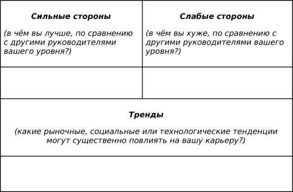 Полезным инструментом для определения своего позиционирования может стать SWT-анализ. Механика этого инструмента заключается в составлении списков сильных и слабых сторон (оба списка – это внутренние факторы) и трендов (актуальные для вашей цели изменения внешней среды, включающие демографические, регулирования, технологические, экономические, потребительские и другие тренды) с дальнейшим их сопоставлением.