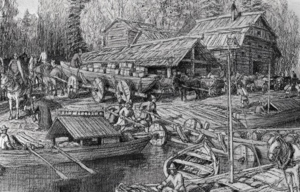 Прекрасной иллюстрацией обустройства волоков, создания вокруг них инфраструктуры может служить картина Васнецова А. М. (младший брат более известного Васнецова В. М.) «Волок на Ламе» (см. рис. 5), где художник выступает в роли реконструктора, воссоздавая «Волок Ламский» времен Древней Руси.