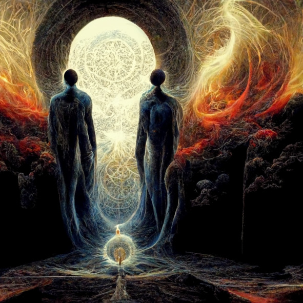 На этих словах небо озарилось яркой вспышкой и волна ледяного света прошла сквозь Путника. Прошла насквозь, забрав с собой все сомнения и боль, оставив лишь пустоту и молчание. Путник ощутил в себе невиданную до этого силу, встал и продолжил свой путь по бескрайнему полю. В этот час им двигало сильное внутреннее чувство, которое несло его по неизведанным просторам, преодолевая все встречные препятствия и преграды. Он шёл и шёл и не было внутри него ни капли сомнения и не было усталости… Холод, пробиравший до костей, или знойная жара, от которой кожа покрывалась волдырями – Путнику всё было нипочём. Он шёл, потому что знал, куда он идёт и знание это было сильнее Его самого… Когда он дошёл до конца Земли перед ним открылся удивительный пейзаж. В пространстве над бескрайним обрывом, где кончалась земля и начиналась Бездна, едва-заметные переливающиеся огоньки света то вспыхивали, то вновь затухали, как мотыльки, летящие к свету. Путник был зачарован этой картиной и не заметил как рядом с ним оказался юная дева, ее лицо скрывал чёрный капюшон, а в руках была связка дров.