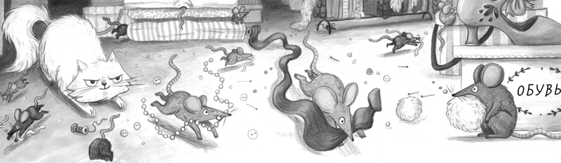 Кот как раз выбирал, какая груда ткани выглядит более удобной для сна, когда услышал тихий шорох. Он замер. Маленькая серая мышка выглядывала из-за коробки с обувью, проверяя, всё ли спокойно. Во рту она держала помпон. Это, подумал Максимилиан, либо мышка-портняжка, либо мышка-воришка, либо мышка-норушка. Неважно, главное, что это вкусная мышка.