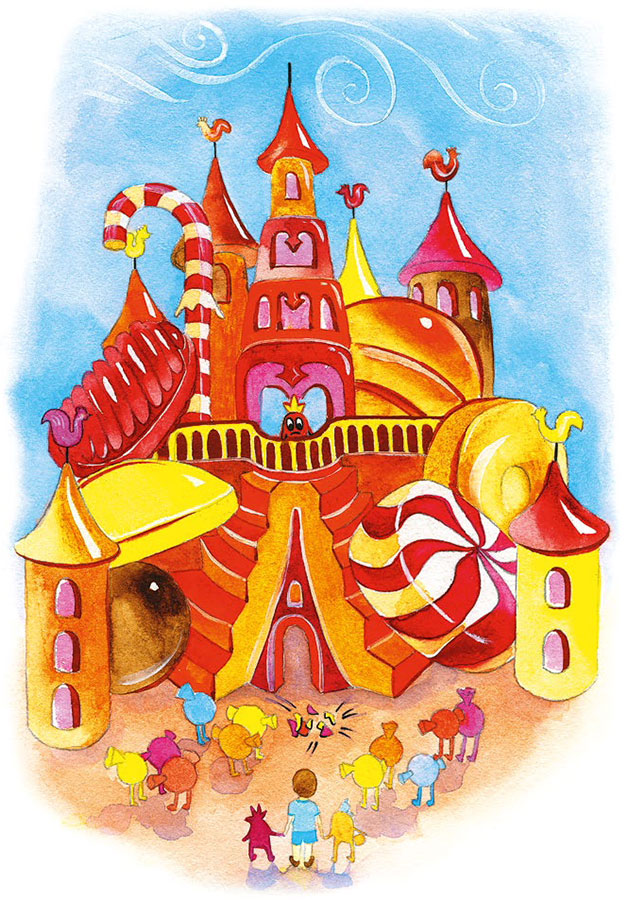 – Раньше мы были просто сливочными карамельками, а потом одна карамелька искупалась в апельсиново-сливочном море и стала апельсиновой, и теперь некоторые из нас там купаются, а на границе с Шоколандией есть шоколадное озеро, и многие карамельки, искупавшись там, становятся шоколадными… – А вот и наш дворец! – сказала Сливочка.