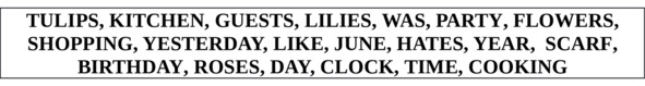 Claire. No, she has a lot of those. Oh! I’ve got it! Her ___________ in the ____________ broke last week. She needs a new one. She loves _____________ and spends a lot of time in the kitchen.