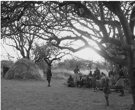 Рис. 1.1. Ранний вечер в племени хадза. Акации создают тенистый оазис в саванне. Мужчины, женщины и дети расслабляются и обсуждают события дня. Обратите внимание на травяной домик слева.