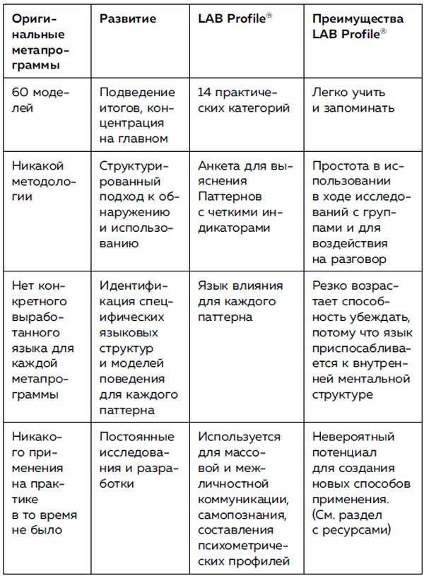 Вот таблица, в которой описывается разница между оригинальными метапрограммами, разработанными Лесли Камерон-Бэндлер, и LAB Profile