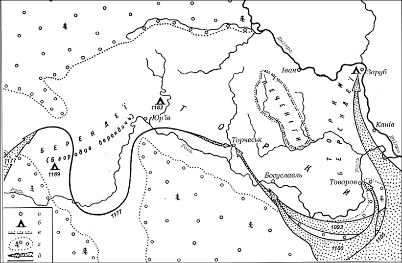 Рис. 4. Поросся в XII ст. (за археологічними даними та літописними повідомленнями): а – давньоруські міста; б – вежі кочівників; в – землі печенігів за археологічними даними; г – ліс; д – походи половців (за С. О. Плетньовою)