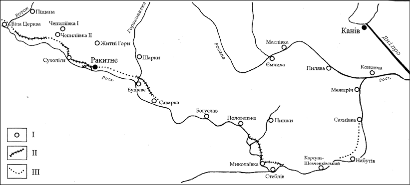 І – городища; ІІ – Змійовий вал; ІІІ – Приблизний напрямок Змійового валу в місцях, де він зберігся (за Л. І. Іванченко та М. П. Кучерою)