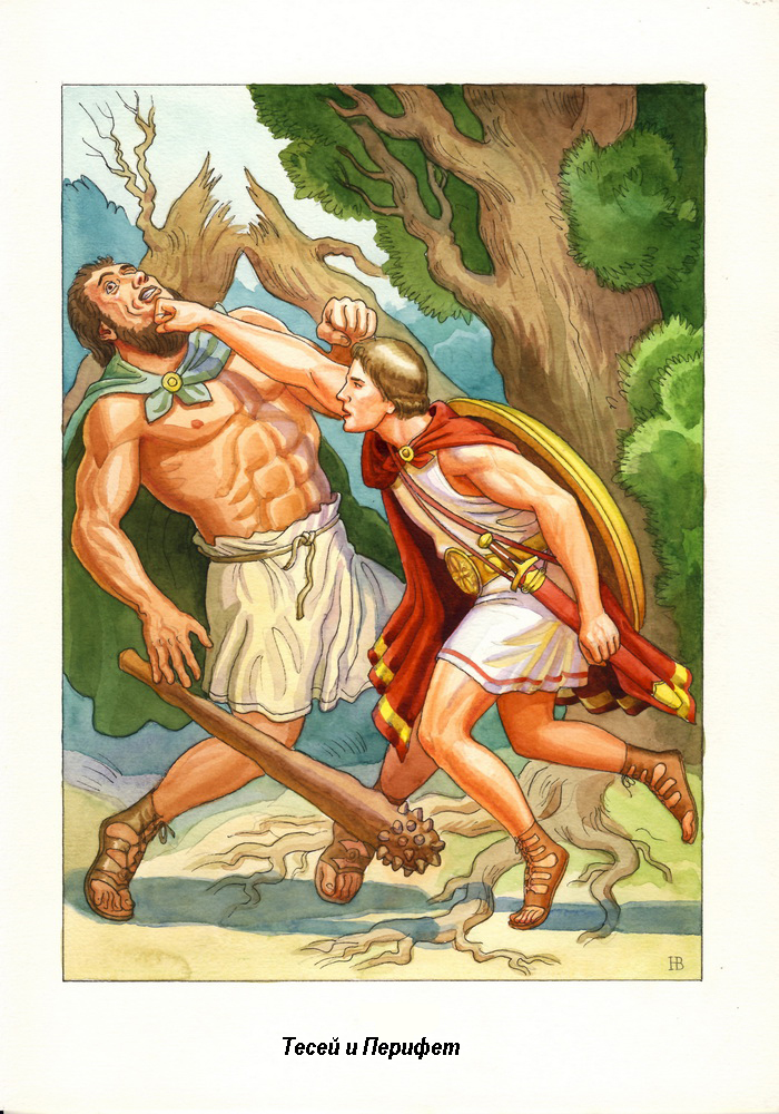 Тесей изловчился и левой рукой крепко схватил дубинку. Злодей дёрнул дубину на себя, но Тесей не отпускал. Перифет необычайно быстрым движением потянул из-за пазухи длинный и острый нож, но не успел: Тесей с размаху ударил его правой рукой по единственному глазу. Громила от неожиданности выпустил дубину из рук и отскочил назад. Перифет даже не успел закрыться от удара, как Тесей обрушил его же дубину ему на голову.