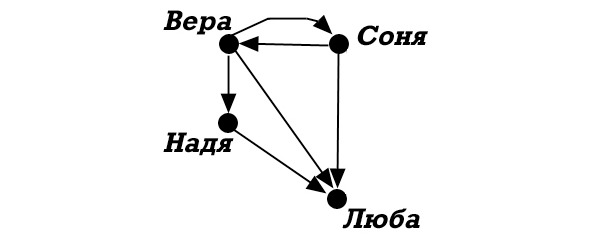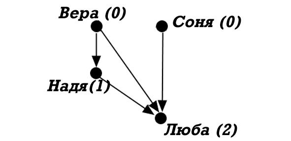 Вера и Соня, у которых нет ни одного «очищенного голоса», присваиваем ранг доброты 0 (ноль). Наде, у которой есть очищенный голос Веры, присваиваем ранг доброты на единицу больше ранга доброты Веры, то есть 1. А Любе, у которой есть 3 очищенных голоса (Веры, ранг доброты 0; Сони, ранг доброты 0, и Нади, ранг доброты 1), присваиваем ранг доброты на 1 больше максимального ранга доброты голосовавших за нее, то есть на 1 больше ранга доброты Нади. Таким образом, ранг доброты Любы – 1+1=2.