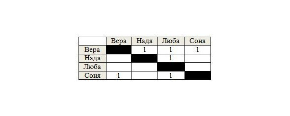 Если одна девушка считает, что другая ее добрее, то ставим 1 на пересечении ряда первой девушки (ставящей оценку) с колонкой второй (получающей оценку).