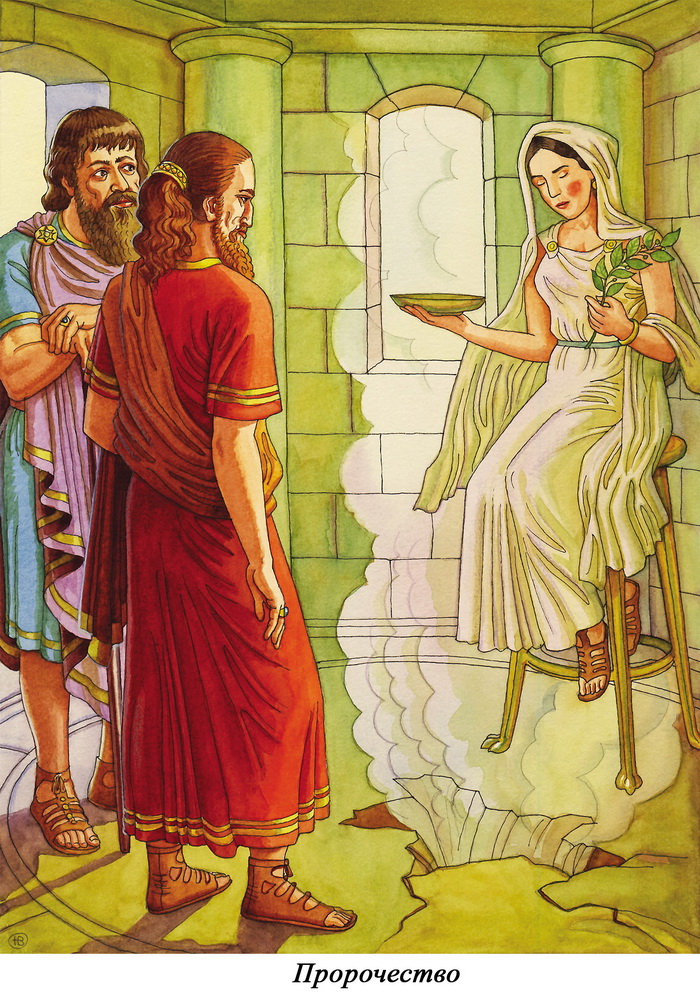 Да помогут нам боги Олимпа, самодовольно произнёс Лаий, окинул покровительственным взглядом стоявшего рядом Креонта и приблизился к Пифии, которая восседала на высоком треножнике в центре святилища. В полу прямо под треножником виднелось отверстие неправильной формы, из которого поднимались клубы дыма. Неприятный резкий запах, усиливавшийся на близком расстоянии, вызывал головокружение и лёгкое помутнение сознания, как при опьянении. Царь некоторое время рассматривал Пифию, которая покачивалась из стороны в сторону на своём треножнике, находясь, очевидно, в полуобморочном состоянии. Её глаза блуждали, а руки бессмысленно двигались.