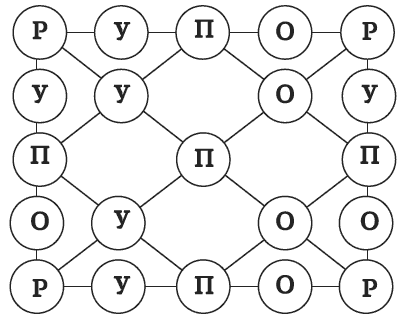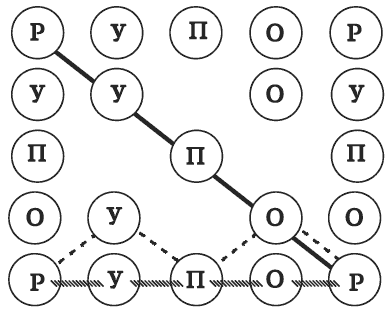 Здо́рово, Карлос! хвалит меня Элиза. У тебя пока шесть! Но нужно найти еще с верхним левым Р и нижним левым Р. Думаю, можно исключить верхнюю правую и нижнюю правую Р, так как рядом с ними нет У.