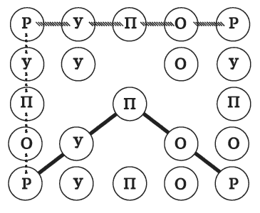 Мы можем сложить слово «рупор» в самой верхней горизонтальной строчке. А потом еще раз в крайнем левом столбце. Верно?