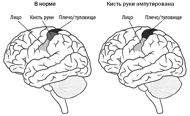 Хотя в первичной соматосенсорной коре карта тела быстро модифицируется под его новое строение, в нижележащих областях она меняется все меньше и меньше. У родившегося без руки ребенка карта будет выглядеть совершенно иначе, но у взрослого человека, например у того же Нельсона, система не настолько гибка, чтобы полностью перестроиться. В глубинах его мозга нейроны, расположенные ниже соматосенсорной коры, не могли в такой же степени поменять свои связи и потому продолжали пребывать в уверенности, что любая передаваемая им активность все еще вызвана прикосновением к руке. В итоге Нельсон чувствовал призрачное присутствие отсутствующей руки[42].