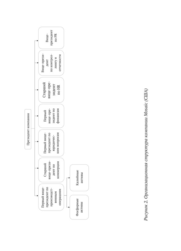 Рассмотрим ещё один пример организационной структуры верхнего уровня. Mosaic (США) достаточно молодая компания, образовавшаяся в октябре 2004 г. в результате слияния Cargill Incorporated и IMC Global. Годовая мощность по калийным удобрениям: 10,4 млн т, годовая мощность по фосфатным: 10,3 млн тонн, распределения и офисные помещения: 8 стран, клиентов: 40 стран, инвестиции в сообщества: 24,2 млн долларов, прямые экономические последствия: 1,6 млрд долларов, калийных шахт и фабрик: 5; фосфатных месторождений и заводов: 9; Количество сотрудников: 8000. Около 1,3 млн т из общего объема приходится на толлинговое производство для PotashCorp. Компания объявила об увеличении производственных мощностей на 5,5 млн т и планировала довести производственные мощности до 15,5 млн т к 2020 году. Mosaic конкурирует с «Уралкалием» на рынках Китая, Бразилии, Индии, Юго-Восточной Азии и России.