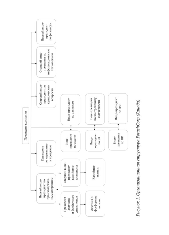 Такая же гибридная функционально-дивизиональная структура, как и у PotashCorp. Но мы не видим представителей закупок на верхнем уровне. Очевидно, что в данной структуре больше «дивизиональности», чем в предыдущей, и эти подразделения находятся в дивизионах.