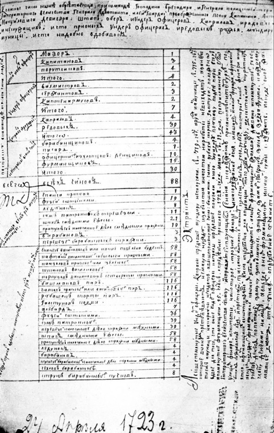 Сохранился рапорт генерал-полицмейстера от 24 апреля 1723 года о том, что его подчиненным четыре года не выдавалось обмундирование (с 1719 года).