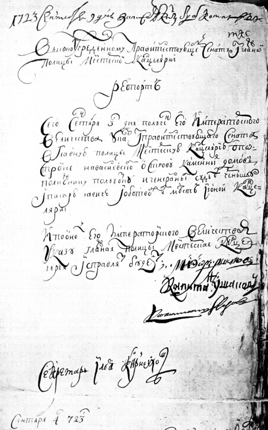 27.02.1723 г. Петр написал Сенату указы: чтоб деревень у тех не отписывать, кои зачали строиться на Васильевском острову, но высылать их немедленно, за поруками наскоро, и велеть им явитца генералу-полицмейстеру (А. М. Девьеру).