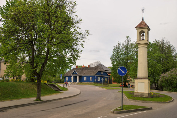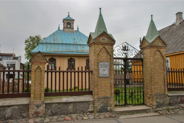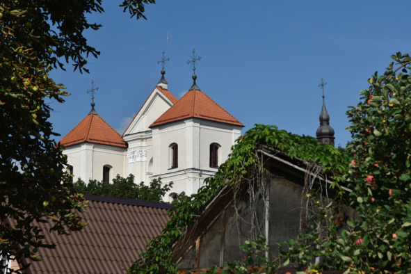 На фасаде храма, у входа, известный знак пилигримов ракушка-гребешок с расходящимися лучами солнца на синем фоне. Довольно необычная деталь, учитывая, что Литва страной, через которую проходит путь Camino de Santiago, не является. Снаружи тишина, внутри праздничная суета. Прихожане в нарядных одеждах, священнослужители в белых одеяниях, все проходы огорожены. Вот-вот какое-то действо начнется.