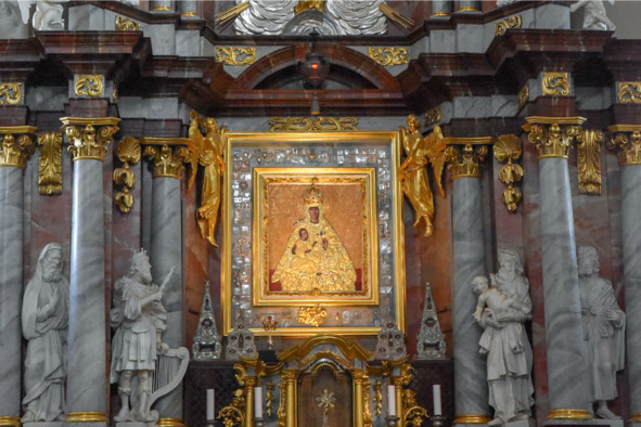 Написанная в XV веке икона Богородицы, провозглашенная за сотворенную милость Покровительницей Литвы с титулом «Просящая за больных», согласно легенде, была подарком византийского императора князю Витаутасу по случаю его крещения, который это таинство в интересах княжества умудрился проделать трижды.
