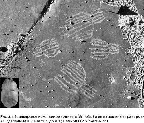Среди троглодитов уже встречались палеонтологи. Таковыми их можно считать вовсе не потому, что они рисовали ныне вымерших зверей, и современные ученые охотно пользуются их подсказками, реконструируя прошлое. Древние люди собирали настоящие окаменелости. Кстати, не исключено, что и зарисовывали их. В Намибии, например, там, где распространены эдиакарские ископаемые, встречаются наскальные гравировки, очень похожие на эрниетту (Ernietta) и птеридиниума (Pteridinium). Предположительно, они высечены художниками в VIIIV тыс. до н. э. (рис. 2.1).