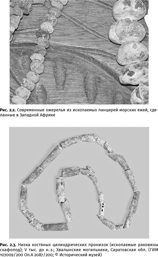 Не менее богаты окаменелостями и неолитические памятники, например Хвалынские могильники V тыс. до н. э., обнаруженные на берегу нынешнего Саратовского водохранилища на Волге. Здесь найдены трубчатые раковины серпулид и скафопод, створки глицимерисов и корбикол. Трубочки нанизывали на шерстяные нити дырки-то в них уже были от природы получались бусы (рис. 2.3).