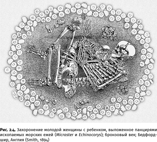 Письменных памятников той поры, к сожалению, не осталось. Лишь люди бронзового и железного веков записали, что они думали об окаменелостях. Хотя о многих деталях можно только догадываться. Скажем, в английском Бедфордшире найдено погребение бронзового века, где юная женщина, свернувшись калачиком, прижимает к себе ребенка, и оба скелета окружены выкладкой из полутора сотен ископаемых морских ежей (рис. 2.4). Возможно, круглые панцири со звездчатым орнаментом были важным символом. Вот только чего?