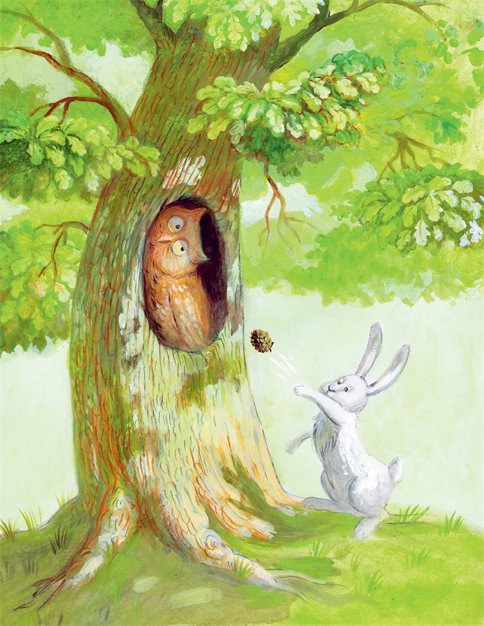 Из тёмного дупла раздалось страшное уханье. Зайчонок очень сильно испугался, но вида не показал, а, наоборот, запустил в дупло шишкой.