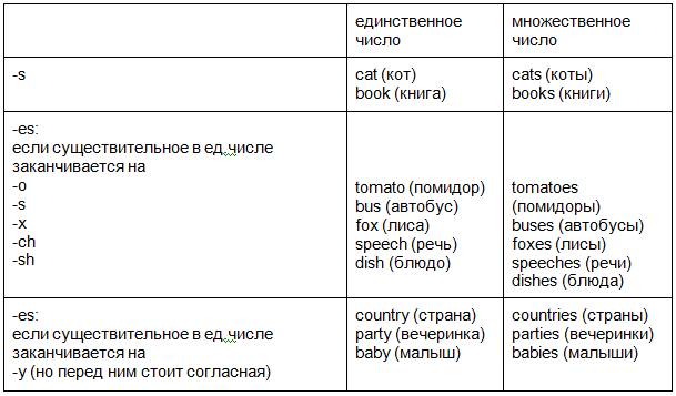 Множественное число у существительных в большинстве случаев образуется путем добавления окончания -s либо -es, в зависимости от того, на какую букву заканчивается слово.