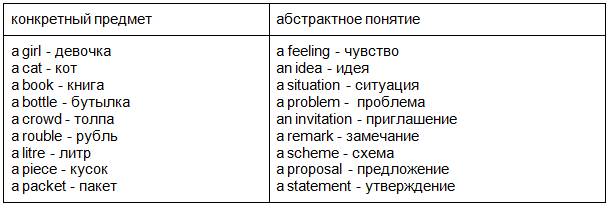 Бывают конкретные (concrete) названия реальных предметов и живых существ, и абстрактные (abstract) названия понятий, чувств, абстракций.