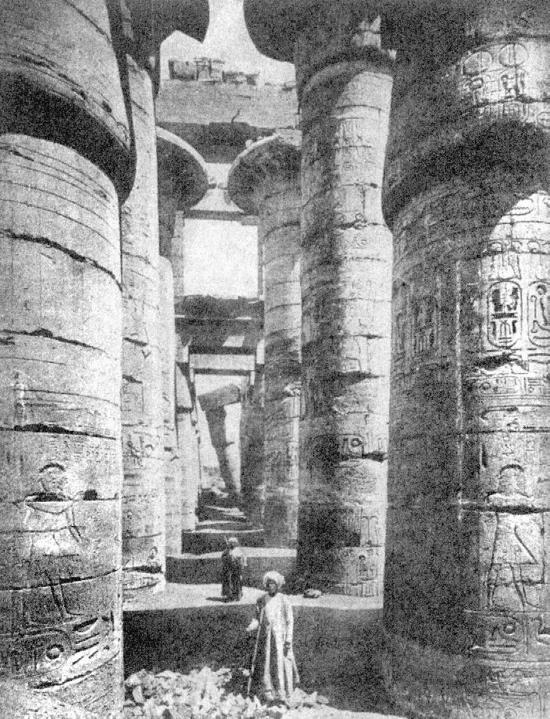Мрака, который верхний ряд окон Карнакского храма не мог разогнать, было достаточно, чтобы с помощью всевозможных заклинаний вызвать суеверный страх перед Амоном-Ра к чему, собственно, и стремились жрецы. Только инженеры не сумели создать больший благоговейный трепет с помощью полутемного, изобилующего пустотами пространства. Небольшая прочность камня на растяжение не позволяла установить более или менее длинные поперечные балки. Колонны были поставлены так густо, что занимали не меньше места, чем огороженные пространства, которые они должны были оставлять. Храм Амона-Ра едва мог считаться большим строительным успехом. Строительный метод Карнака сооружение вокруг колонн и вдоль стен опорных конструкций из кирпича и песка, рамп и террас, на которые можно было затащить каменные блоки и установить их в нужное положение. Временные сооружения поэтапно разрушались по мере того, как шло украшение храма резьбой и росписью. Между тем фундаменты в Карнаке были не так тщательно спроектированы и построены, как в других местах. Наводнения размыли их настолько, что некоторые колонны просели и части крыши обрушились.