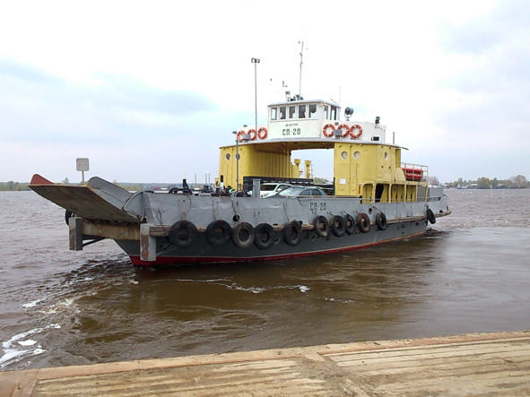 СП-15 самоходный паром с откидной аппарелью на носу для въезда и выезда автомобильного и гужевого транспорта.