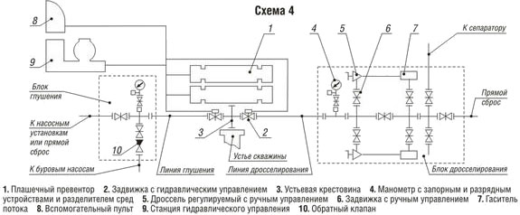 Схемы 1. и 2. используются, как правило, при ремонте скважин, так как имеют механический (ручной) привод плашечных превенторов и задвижек. Схемы 3 и 4 используются как при капитальном ремонте, так и при строительстве скважин и имеют дистанционное гидравлическое управление превенторами и устьевыми задвижками. Схемы с 3 по 10 имеют дистанционное гидравлическое управление превенторами и устьевыми задвижками. Используются, как правило, только при строительстве скважин. В случае отказа дистанционного гидравлического управления превентора и гидрозадвижки должны иметь ручное управление. Согласно требованиям Государственного общероссийского стандарта ГОСТ 1386290 противовыбросовое оборудование имеет следующее условное обозначение: Оборудование ОП 3230/80×35 К2 ГОСТ 1386290 расшифровывается следующим образом: