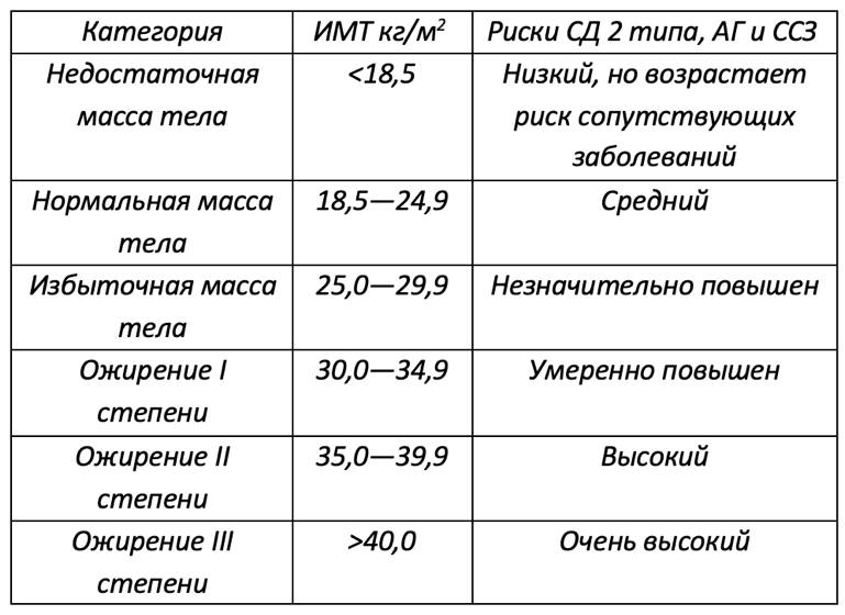 Всемирная организация здравоохранения (ВОЗ) классифицирует (1998) ожирение и риск сопутствующих заболеваний (сахарного диабета 2 типа СД 2 типа, артериальной гипертензии АГ, сердечно-сосудистых заболеваний ССЗ), в зависимости от индекса массы тела (ИМТ), следующим образом.