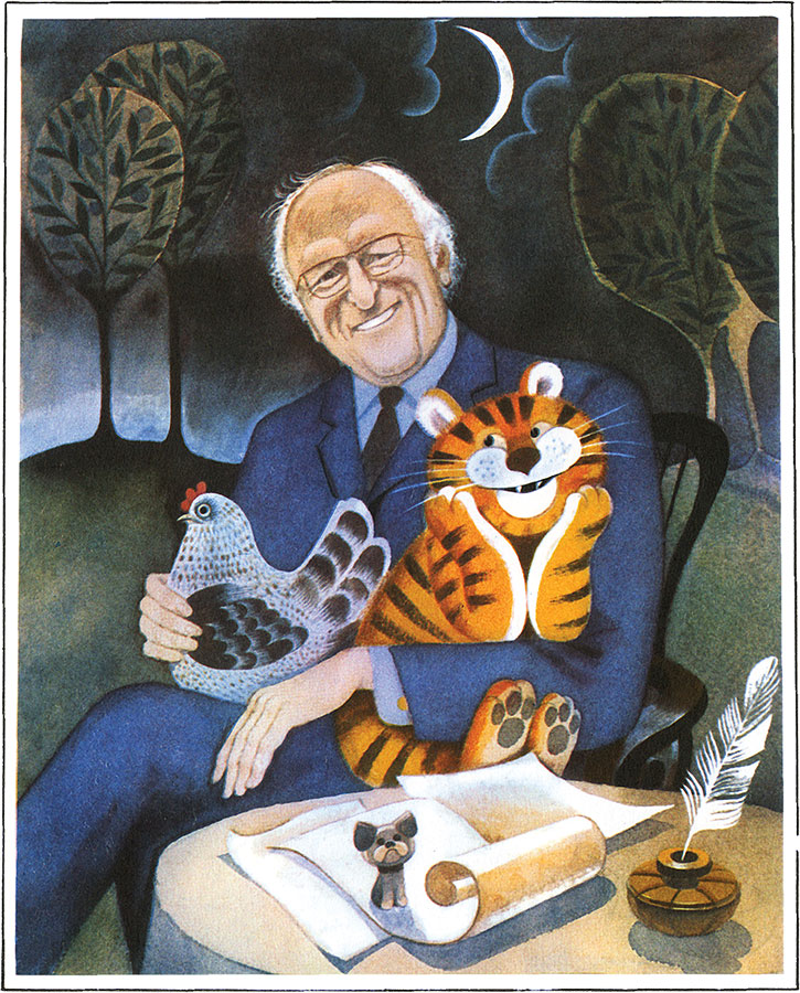 А теперь моя очередь, сказал Рррр. Я вас познакомлю с Дональдом Биссетом. Он настоящий знаменитый сказочник. Живёт в Англии и пишет сказки, рисует к ним картинки и сам рассказывает свои сказки по телевидению, потому что он актёр. Играет в театре, снимается в кино и умеет ездить верхом на лошади